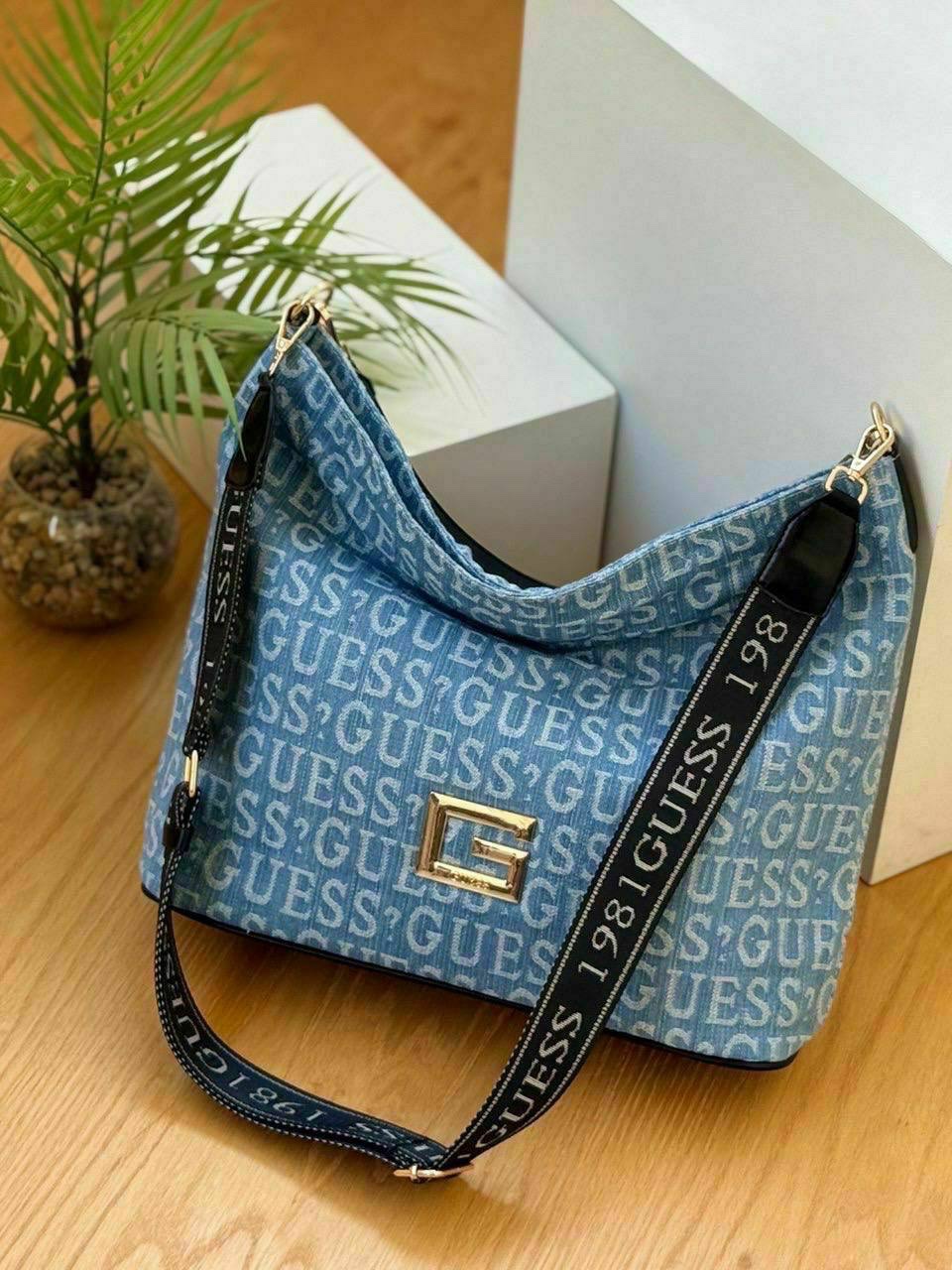 شنطة كتف نسائية مصنوعة من خامة جينز عالية الجودة، بتصميم شيك ومودرن يناسب كل الإطلالات. مزودة بحزام عريض مطبوع قابل للتعديل، مع إكسسوار ذهبي أنيق يضيف لمسة فخامة.