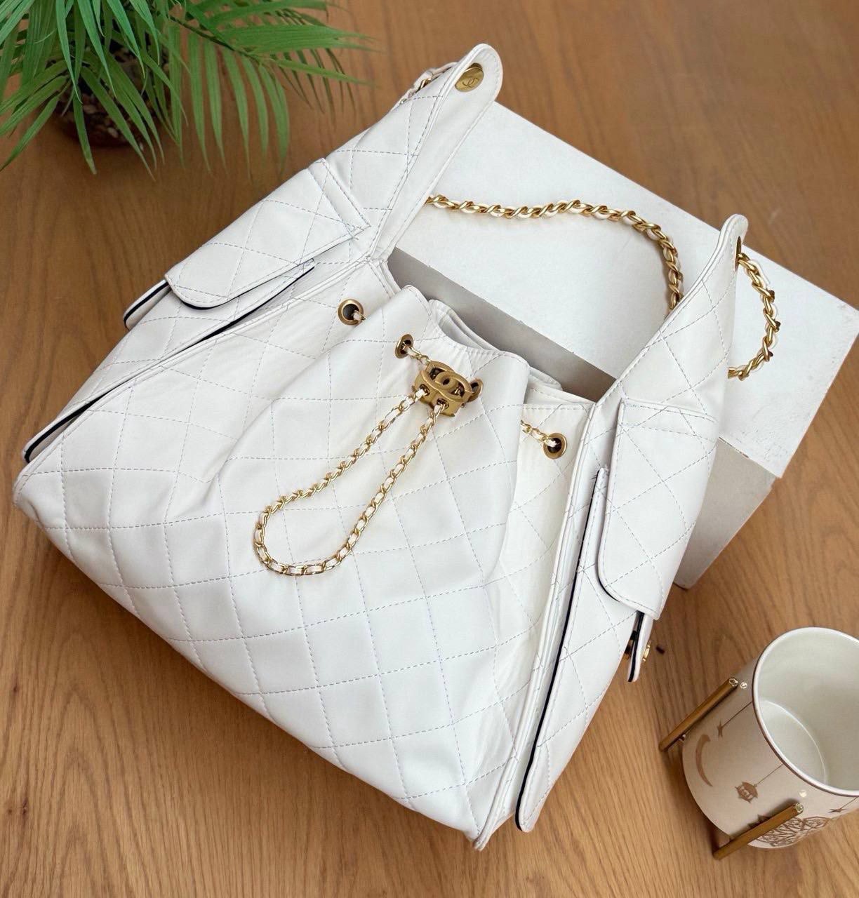 استمتعي بإطلالة فاخرة مع شنطة Chanel Style Bucket المبطنه بتصميم أنثوي أنيق وسلسلة ذهبية مميزة.